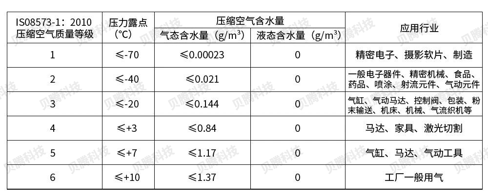 壓力露點(diǎn)越低,壓縮空氣質(zhì)量等級(jí)越高,壓縮空氣含水量越低。