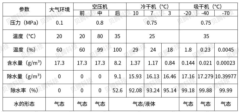 壓縮空氣中的水通常以液態(tài)水和氣態(tài)水兩種形態(tài)存在,且相互可以轉(zhuǎn)化,這就導(dǎo)致壓縮空氣穩(wěn)定可靠的除水成為世界性的難題,通過(guò)下表可以清晰看到壓縮空氣水含量在空壓系統(tǒng)中的變化情況: